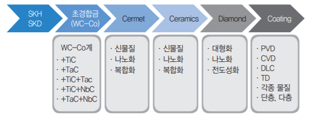 절삭공구는 최근 부품의 경량화와 고강도화를 통해 각종 환경규제에 대응하기 위해 사용이 급증하고 있는 탄소섬유강화플라스틱(CFRP), 고강도흑연주철(CGI), 인코넬 및 티타늄합금 등 난삭재의 고효율 가공과 첨단산업의 글로벌 시장선점에 있어서 절대적인 영향을 미칩니다.
